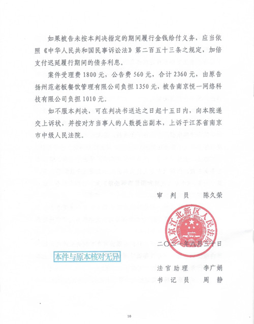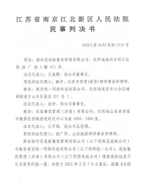 年初,连起餐饮被其他公司以“侵害商标权及不正当竞争纠纷”为由告上了法庭。纷纷扰扰半年多的案件已经落下帷幕,今年9月,江苏省南京江北新区人民法院对这场民事官司作出了判决,连起餐饮胜诉。